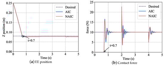 Simulation results in Figure 4b–d illustrate that the robot is in contact with the environment at m since s. For both NAIC and AIC, the contact force successfully tracks the desired force. However, in the contact phase, the damping parameter is adaptively adjusted under NAIC and allows the contact force to track more quickly and smoothly than the AIC to the desired force.