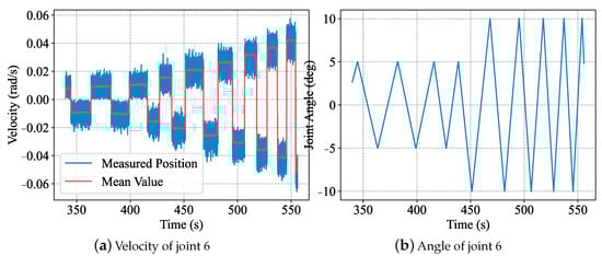 Joint friction compensation must be performed for a real robot arm to have excellent control results. According to the friction model in (5), the joint friction is a function of the angular velocity . Equation (1) shows that the gravity torque is related to the joint position q. In the experiment, the initial position of the robot is zero position. The six joints of the robot are controlled to move sequentially at different speeds within a certain range. The velocity, joint angle, and the corresponding torque of each joint are measured. The joint friction moments can be obtained by subtracting the gravity torque from the measured torque. Taking the sixth joint as an example, the measured velocity and angle are shown in Figure 5.