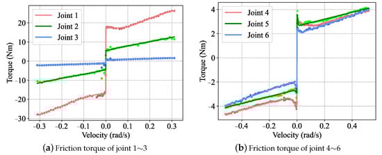 The relationship between friction torque and joint velocity. The dots represent the measured data, and the solid lines indicate the identified results.