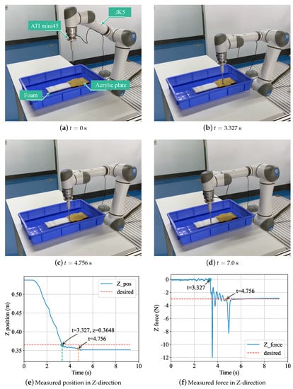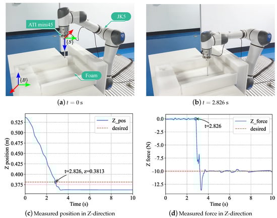 In this experiment, the environment consists of an acrylic plate and foam (see Figure 8a). It is obvious that the stiffness of the two materials is different. Therefore, this experimental setup can be used to simulate the interaction between the robot and the unknown environment.