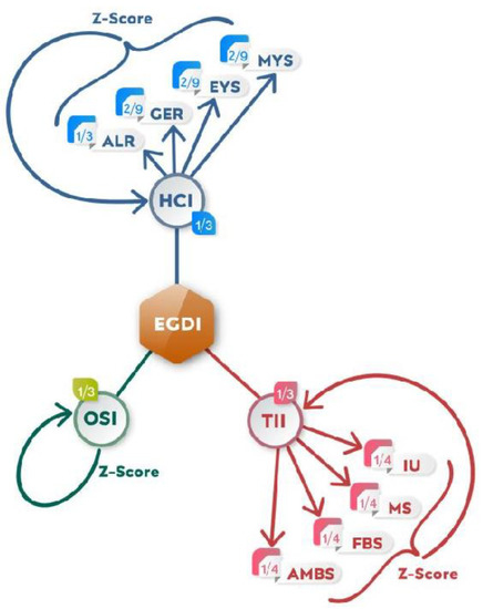 Each composite index is subject to a Z-score standardisation procedure to ensure comparable variance so that the EGDI will be the weighted average of the normalised scores of each component. The standard Z-score formula is: