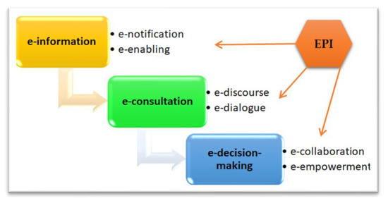 The second indicator used in forming clusters, as presented in Figure 2, the e-participation index (EPI), is determined based on a questionnaire [45] also consisting of questions with binary answers to questions that cover six sub-dimensions of digitisation in the public system.