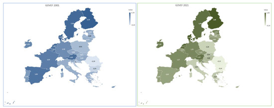 Analysing the evolution of GOVEF in Figure 3, we observe that at the level of EU member states, Romania and Bulgaria register negative values for the indicator, especially during the periods of the economic crisis (2008) and pandemic crisis (2020). The blue area marks the level of government effectiveness in 2001 and the green area marks the level of government effectiveness in 2021 in the member states of the European Union. The intensity of the blue or green colour indicates higher government effectiveness, while the lightness of the colour indicates weaker government effectiveness. If the lack of trust in the government’s efficiency is perhaps justified in these states with a low level of development compared to the rest of the member states, we cannot say the same about states such as Italy, which has a low level of appreciation of the government’s efficiency.