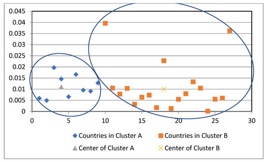 This explains the division into two clusters due to the digital divide in Europe (Figure 5). The situation is determined by the fact that although e-government has enjoyed growth and development, not all citizens are willing to use such services [56,57]. Unlike e-commerce, where customers can be selected, in e-government, government agencies ensure access to the entire population, including people with lower incomes and disabilities [58].