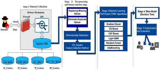 Next step, data normalization and encoding processes are performed. Encoded data undergoes a dimensionality decrease to aid data handling. Accordingly, features are optimized to attain the optimal features out of the entire data. This is helpful to detect anomalies within data. After preprocessing, the cleansed data will transfer to the next level to utilize impacted features only to the finalized results by applying Chi-square. Ultimately, the proposed system uses meta-ML models as a classifier to detect and predict malicious activities in the network traffic. It includes a number of stages that include several steps with a dedicated task each. Each stage’s outcome represents an input to its next stage. The stages are described in detail successively.