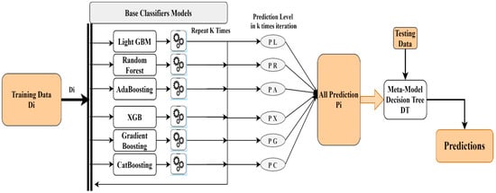 For the training stage, many different classifiers are used (i.e., XGBoosting, random forest (RF), AdaBoosting, GradientBoosting, LightGBM, and CatBoost) each of them considered as a base classifier. Each of these classifiers manipulates the training data independently by taking the Di of each dataset. Afterby, the results of each base classifier (predictions) are aggregated into the meta-model (DT), Figure 3 demonstrates the main idea of meta-model classifiers. Furthermore, the testing stage begins in the meta-model to get the prediction results to check the evaluation and performance of the proposed meta-model. Algorithm 2 illustrates this stage.