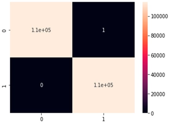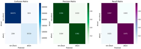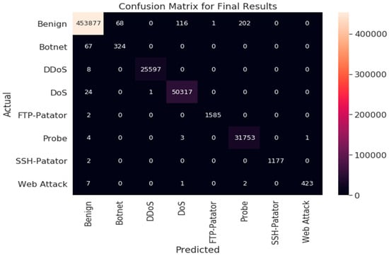 Figure 4 shows that the proposed system achieves the best prediction results, it distinguishes benign activities and attacks precisely, and it can be noticed that only one percent of the benign activities is predicted as an attack; this result does not affect the final results.