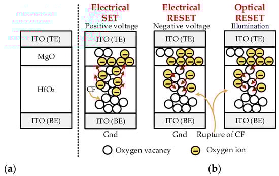 The modeled optoelectronic memristor device is prepared from ITO/MgO/HfO2/ITO material, where two layers of transparent conductive oxide ITO are used as the top electrode (TE) and bottom electrode (BE) of the device []. The wide bandwidth oxide (MgO/HfO2) introduces the optical functionality in the resistive switching device while maintaining the optical transparency, and the MgO layer increases the durability, retention performance, and resistive ON/OFF ratio of the device. The specific device structure is shown in Figure 1a.