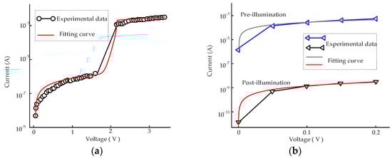 The fitting result of the model showing (a) I−V curve of the memristor in the dark environment; and (b) I−V curves of the memristor before and after applying illumination.