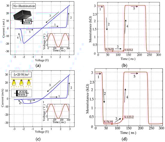 Figure 3 illustrates the electrical characteristics (volt-ampere characteristics and memristance variation rule) of the memristor under different illumination conditions. The relationship between the current flowing through the memristor model and the applied voltage is shown in Figure 3a,c, and the variation of memristance with time is shown in Figure 3b,d.