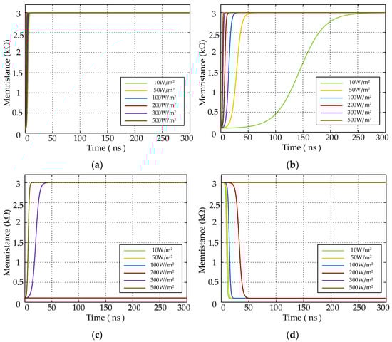Figure 4 shows the results of the effect of optical stimulation with different irradiation power densities and constant voltage of different amplitudes on the variation pattern of the memristance. Figure 4a–c shows the memristor response curves upon the application of electrical stimuli of 3 V, 0 V and −3 V to the memristor model with the initial resistance Ron within the time interval [0, 300]ns at different optical power densities (i.e., 10, 50, 100, 200, 300, and 500 W/m2), respectively. Considering that the resistance state of the memristor with initial resistance Roff will not change with external electrical stimuli of −3 V and 0 V, thus only the effect of different optical power densities on the memristance under 3 V positive voltage is simulated. From Figure 4a,b, it is obvious that the higher the optical power density, the faster the rate of resistance enhancement. A summary analysis of Figure 4c,d shows that a sufficiently large optical stimulus can surpass the effect of positive voltage on the electrical characteristics of the memristor. Notably, the green, yellow, blue and red lines in Figure 4c are overlapped, and the purple and brown lines in Figure 4d are overlapped.