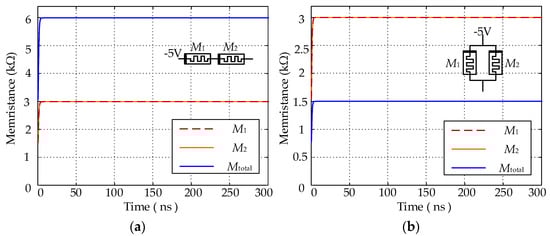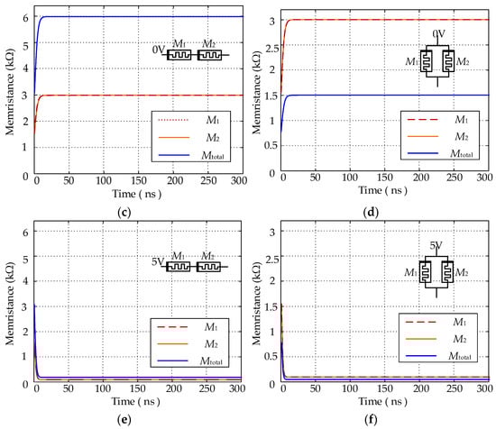 From Figure 5, since the model parameters (including the initial memristances) of the two memristors are the same, the corresponding resistance variation pattern (which can be referred to the resistance variation pattern in Figure 3d) is also the same, as shown in the overlapping of the red dashed line and the orange solid line. When two memristors are connected in series in the same direction, the resistance state of both memristors changes to the HRS under the combined effect of negative voltage and illumination, as shown in Figure 5a. In the case of illumination separately, as shown in Figure 5c, the resistances of both memristors also increase to Roff. Notably, compared to Figure 5a, the change (growth) curve of the resistance is relatively smooth owing to the lack of the effect of the negative voltage. Under the effect of positive voltage, as shown in Figure 5e, the resistance of both memristors decreases owing to the lower power density of illumination radiation, whose effect on the optoelectronic memristors is smaller than that of positive voltage. In addition, when two memristors are connected in parallel in the same direction, as shown in Figure 5b,d,f, the resistance variation trend of the two memristors is the same as that in series in the same direction. However, when the same voltage is applied to the input, the voltage divided by the parallel memristors is larger, so the rate of resistance variation is relatively faster. Moreover, the equivalent resistance Mtotal of the series circuit is calculated as the sum of the resistance M1 and M2, i.e., Mtotal = M1 + M2, and the equivalent resistance of the parallel circuit satisfies: Mtotal = M1 ∗ M2/(M1 + M2).
