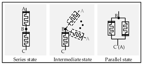 The schematic diagram of the composite memristor circuit based on the rotation mechanism is depicted in Figure 6, where A, B, C are the ports of the connection line, and port B is the center of rotation. The rotation mechanism enables the conversion of series and parallel configuration circuits, and the circuit during the conversion contains an intermediate state in addition to the series and parallel states.