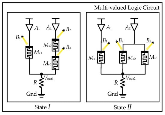 Incorporating the composite circuit based on the rotation mechanism, a circuit for implementing multi-valued logic is designed (as illustrated in Figure 7). Note that the proposed circuit contains two valid states during rotation, i.e., state I and state II.