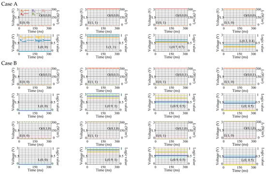 Figure 8 shows the simulation results of the multi-valued logic circuit (including states I and II). A1 (the orange solid line) and A2 (the red dashed line) indicate the input electrical signals, which are represented in the figure as the first column E(0, 0), the second column E(1, 1), the third column E(0, 1), and the last column E(1, 0) for four electrical writing cases. B1 (the purple dotted line), B2 (the green dashed line), and B3 (the pink dashed line) indicate whether or not an optical signal is applied to the memristor, written by O(i, j, z), and correspond to the optical case in the previous section. Vout1 and Vout2 of state I and II are indicated by the yellow solid and the blue dashed lines, respectively. The logical state variables are represented by the yellow dashed and blue solid lines, respectively, denoted as L(m, n).