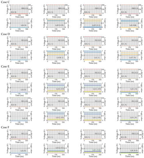 As in the theoretical analysis, the simulation results are classified into Case A–Case F depending on whether or not illumination is applied to the memristors. Under Case A, Case C, Case D, and Case F, the simulation results are further divided into four cases according to whether the voltage is applied at the input ports, corresponding to the first row, the fourth row, the fifth row, and the last row in Figure 8. In addition, Case B (Case E) contains two cases, B2 = Ipl, B3 = Iph and B2 = Iph, B3= Ipl, for which the simulation results in Figure 8 contain eight small diagrams. From the first column of Figure 8, the voltage is not available at the output regardless of whether there is a light input or not, which corresponds to logic “0”, since there is no voltage at the input. From Figure 8, the relationship between the input logic state variables and the output logic state variables obtained from the simulation corresponds to the truth table (Table 4), demonstrating that the circuit is capable of implementing multiple logic functions from 0–1, as well as verifying the validity of the constructed optoelectronic memristor model.