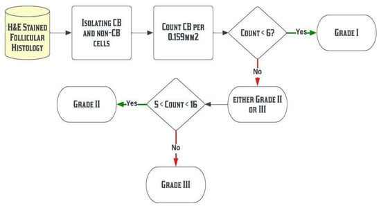 If the count of CBs is less than 6 (i.e., 0–5), then histology is the grade I. If this number ranges from 6 to 15 per HPF, then FL histology is classified into grade II. Otherwise (count is more than 15), FL histology is classified into grade III, as shown in Figure 2 [,,].