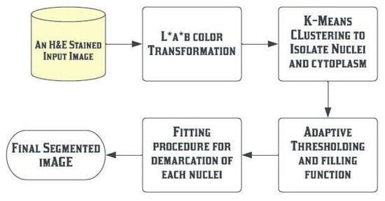 Unsupervised segmentation divides the images into distinct cytological components to collect these data. Normally, there are five main components in H&E-stained FL images: the nucleus, cytoplasm, background, red blood cells, and extracellular material. The entire methodology is divided into four major steps. In the first step, H&E-stain is projected over L*a*b* color space, and then k-means clustering is used to isolate different cytological components in the second step. In the third step, pre-processing techniques of adaptive thresholding and area filling function are applied to give them proper shape. Finally, proper demarcation of each nucleus is performed. Figure 3 shows the flow of the proposed methodology to isolate different cytological components.