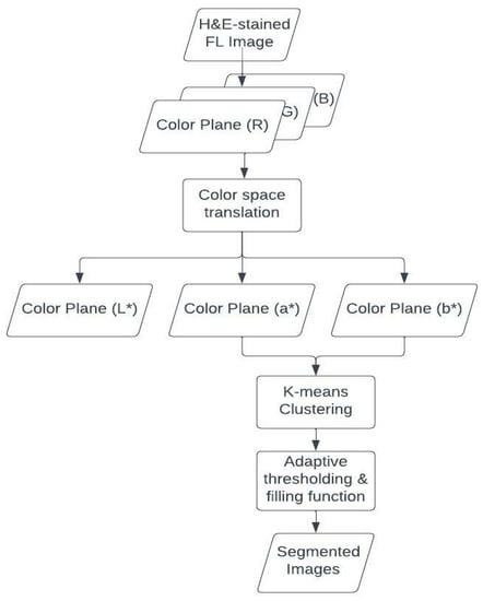 Various segmentation methodologies have been proposed to extract these quality parameters and keep visual differences based on textural heterogeneity [,,,] and the morphological structure [,,] of each cytological component (nuclei, cytoplasm, extracellular component, RBC, and background). These morphological and textural parameters are extracted with various segmentation approaches, e.g., thresholding technique [], Otsu thresholding [,], Otsu thresholding followed by LDA [], thresholding followed by k-means [,,,], k-means with graph cut method [], textural parameter followed by PCA and k-means [], L2E along with canny edge and Hough transformation [,,,,], gaussian mixer model and expectation maximization [], mean shift elimination [], contour models [,,,,,,,,,], color-coded map based [], watershed [,], piecewise [] entropy-based histogram [], level-set [], and transfer learning approaches for feature extraction [,,] have been introduced to segment histopathological images. Many works have been performed in image segmentation, available in survey resources. However, there is still no universally accepted algorithm to segment the images as it is influenced by many aspects, such as the image’s texture, image content, and the inhomogeneity of images. In the next section, this paper proposes a noble approach to isolate various cytological components from H&E-stained FL tissue samples.