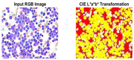 Firstly, each of these components is expressed as a different color. Since the difference between two colors in the L*a*b* color space is perceptually uniform, the Euclidean distance can be employed as a measurement during the segmentation process. As a result of their relatively consistent patterns, RBCs and background regions can be distinguished by thresholding the intensity values in the RGB color space. RBCs and background are not comparatively useful when classifying FL histology, so our concentration is on identifying the rest cytological components. The remaining structures must divide into three clusters representing nuclei, cytoplasm, and extracellular material. The flow diagram to isolate different cytological components is explained in Figure 4. The image is projected onto this paper’s a*b*, L*a*, and L*b* spatial domains. Results for step 1 are placed in Section 4.1.