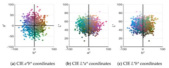 Figure 5 converts the RGB image to CIE L*a*b* transformation using Equation (2). The three-dimensional CIELAB space covers the complete spectrum of human color vision.