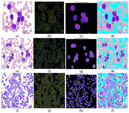 Output of L*a*b* projected k-means clustering (K = 3) algorithm. (a,e,i) Input Images (b,f,j) Different hue levels (c,g,k) Isolation of nuclei (d,h,l) Clustered Images.