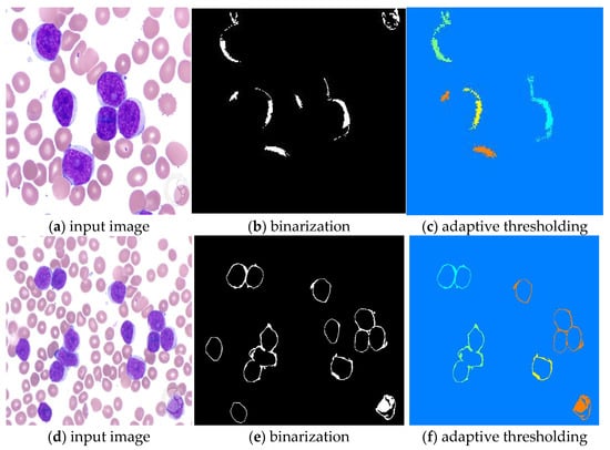In the next step, with the help of another critical parameter, the cytoplasm is extracted from the given input images, as shown in Figure 8. Images (a) and (d) are input images, (c) and (f) are the images of cytoplasm with different hues, and images (b) and (e) present the binarization of images (c) and (f) via the adaptive thresholding procedure. These morphological features vector is essential and will help pathologists to classify histology into respective grades.