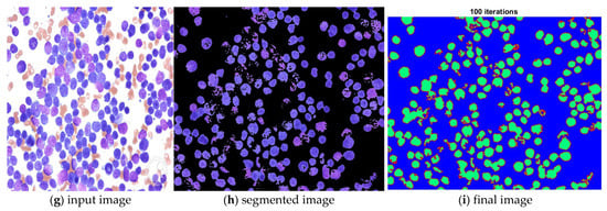 In Figure 9, images (a), (d), and (g) are input images, and images (b), (e), and (h) are segmented images after the k-means clustering, thresholding function, and area-filling function. Images (c), (f), and (i) are the final images after the demarcation of each nucleus with red colour.