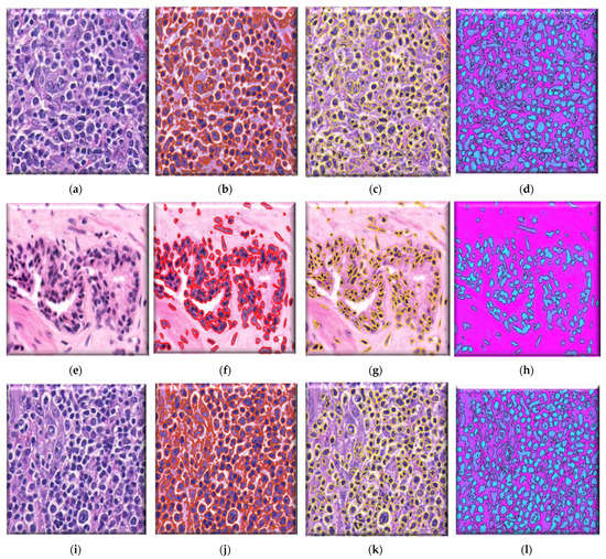 This transformed image passes through the k-means clustering procedure. This clustering procedure extracts three major cytological components: one in all nuclei, another in the cytoplasm, and the last in the extracellular components. In Figure 7, images (a), (d), and (i) are the 3-input image randomly taken from the database belonging to grades I, II, and III, respectively. In images (b), (f), and (j) representation of different hue levels of each cytological element are represented. Isolation of only nuclei is presented in images(c), (g), and (k). These images are hued with dark blue, while images(d), (h), and (l) represent three different clustered images.