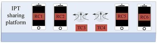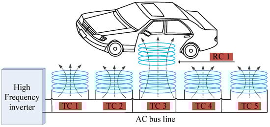 Inductive power transfer (IPT) technology is considered to be a good solution to replace the traditional electrical connection method due to its advantages of security, flexibility, aesthetics and reliability []. With the development of technology and the expansion of the application field, an IPT system with multiple transmitting coils has become a research hotspot [,,]. It is mainly used in specific scenarios, such as IPT sharing platforms for electronic devices, dynamic wireless charging for electric vehicles or automated guided vehicles, etc. [,]. The IPT sharing platform for mobile phones is shown in Figure 1. It includes multiple transmitting coil arrays which can charge one or more phones at the same time []. The concept diagram of a dynamic IPT system is shown in Figure 2, and the transmitting coil (TC) is selectively coupled to the moving receiving coil (RC) as the car passes through the charging section. The common point of the two application scenarios is that the transmitter of the IPT system includes any number of transmitting coils according to the application needs, and the receiver includes one or more receiving coils as the space permits. Compared with an IPT system with one transmitting coil, the IPT system with multiple transmitting coils has experienced some new technical problems, such as complex coordination and control among the transmitting coils, electromagnetic field (EMF) leakage of the standby transmitting coils, low system efficiency, etc. [].