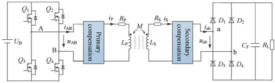 The schematic diagram of the IPT system is shown in Figure 3, which is mainly composed of a DC voltage source, a full bridge inverter, primary and secondary compensation networks, transmitting and receiving coils, a rectifier, a filter and a load. Here, UD is the DC input voltage. Q1–Q4 are four switches, which form a full bridge inverter; uAB and iAB represent its instantaneous output voltage and current, respectively. The compensation networks are composed of one or more inductors or capacitors. LP, RP are the inductance and parasitic resistance of the transmitting coil, respectively. LS and RS are the inductance and parasitic resistance of the receiving coil, respectively. M represents mutual inductance between the coils, which is described as , where k is the coupling coefficient. D1−D4 are four diodes that constitute a rectifier; uab and iab represent its instantaneous input voltage and current, respectively. The capacitance CF is the filter, and RL is the load.