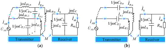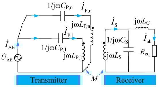 The primary side of the S−LCL compensation topology is simple, and the secondary side is convenient to adjust []. Through proper configuration, no−load overcurrent can be avoided. Therefore, the S−LCL topology is adopted in this paper. As shown in Figure 5, the IPT system consists of a transmitter and a receiver, the transmitter is composed of multiple transmitting coils which are connected in parallel to a single inverter, and the receiver is composed of a receiving coil, a compensation element and a load, which may be one or more. In order to simplify the analysis, assuming that each transmitting coil is identical to the others, the mutual inductance between the adjacent transmitting coils can be ignored, and the parasitic parameter of each component is ignored.