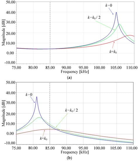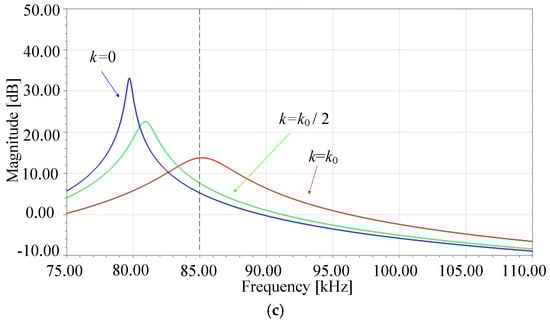 As shown in Table 1, the S−LCL topology satisfies the relations and . The SR of the three systems can be obtained by drawing the current curve variation with a frequency at k = 0, k = k0/2 and k = k0. As shown in Figure 7a, the transmitting coil current with the LCC−P topology is constant at the operating point of 85 kHz, which means that the SR is equal to 1. As can be seen from Figure 7b, the transmitting coil current with the S−P topology in the uncoupled state is the smallest at the operating frequency, which means that the SR is less than 1. For the S−LCL topology, the maximum current of the transmitting coil in the uncoupled state is shifted further from 85 kHz, resulting in a lower current of the standby transmitting coils (as shown in Figure 7c). Therefore, the proposed S−LCL topology achieves the purpose of “field focusing” compared with the LCC−P and S−P topologies.