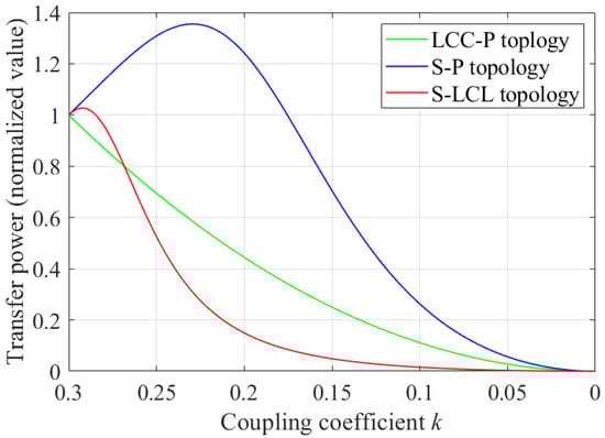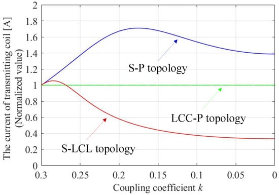 Based on Equations (25)–(27), the relation curves of the transmitting coil current and power with the coupling coefficient can be obtained, as shown in Figure 9 and Figure 10, respectively. As shown in Figure 9, when the coupling coefficient varies, the transmitting coil current for the LCC−P topology remains unchanged. The transmitting coil current for the S−P topology is the minimum when the coupling coefficient is maximum, indicating that the S−P topology is not conducive to transfer power and to prevent EMF leakage. For the S−LCL topology, the transmitting coil current decreases with the decrease in the coupling coefficient, thus limiting the EMF leakage and reducing overall losses.