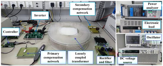 In order to verify the correctness of the theoretical analysis, an experimental prototype was built, which is shown in Figure 11. It consisted of IT6523D DC power supply, a driver, a full−bridge inverter, transmitting and receiving coils, a compensation network, a diode rectifier, a M9715B DC electronic load, a Tektronix MDO3052 oscilloscope, a HIOKI PW6001 power analyzer, etc. Here, the MOSFETs of the inverter were C3M0120090; the rectifier diodes were selected as IDW20G65C5SiC. The planar circular coil was selected as the magnetic coupling mechanism because of its wide application.