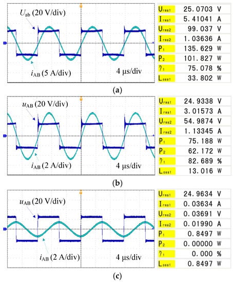 When α = 3, the measured waveforms and results are shown in Figure 12. The voltage and current waveforms of the inverter are measured by the oscillator and the DC−DC efficiencies are measured by the power analyzer. Among the measured items, Urms1, Irms1 are input DC voltage and current, Urms2, Irms2 are output DC voltage and current. P1 and P2 represent input and output power, respectively; η1 and Loss1 represent the efficiency and losses of the system. As shown in Figure 12a,b, the phase angle between the voltage and current waveforms of the inverter is almost zero. It indicates that the input impedance of the system is pure resistance in the fully coupled state. When the system works in the uncoupled state, the phase angle between the voltage and current waveforms of the inverter is almost 900 (as shown in Figure 12c), indicating that the input impedance of the system is inductance, which is consistent with the theoretical analysis in Section 3.