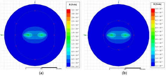 The electromagnetic environment problem is mainly caused by the high frequency current in the coupling coil. The high frequency electromagnetic field around the whole coupling mechanism will affect the safety of the equipment and the organisms in the adjacent area. The magnetic fields of the coupling coil and the uncoupling coil are compared using ANSYS Maxwell software. As shown in Figure 13, the simulation coil is set up as the experimental coil, consisting of 26 turns with an inner diameter of 20 cm and an outer diameter of 28 cm, to verify the flux attenuation capacity of the standby transmitting coil.