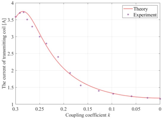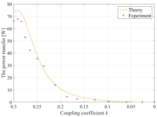 In order to further verify the field focusing capability of the system, transmitting coil currents with different coupling coefficients were measured, which are shown in Figure 15. Similarly, the power measurements, as well as the theoretically calculated output power from (27), are shown in Figure 16. It should be noted that there are voltage drops for various components, such as MOSFET, the capacitor and the inductor in the experiment, which are not considered in the theoretical analysis, so UD is reduced from 25 V to 23 V in the theoretical calculation. The measured results of the transmitting coil current are basically consistent with the theoretical calculation. The measured results of the power transfer are smaller than the calculated value (under high coupling coefficients). The reason for this mismatch is that the losses of power electronic devices and the losses of parasitic resistances are ignored in theoretical calculations.