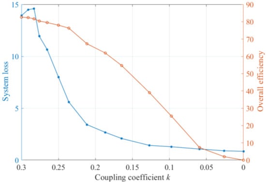 The system loss and efficiency measurements with respect to the coupling coefficient k under α = 3, Q = 4.