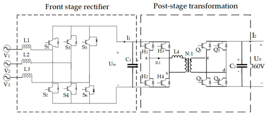 Figure 3, the pre-circuit uses a voltage source type three-phase full-bridge PWM converter (VSC), and the backstage DC converter module uses a Dual Active Bridge (DAB).