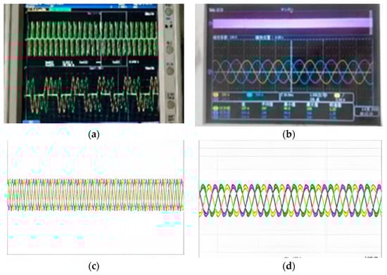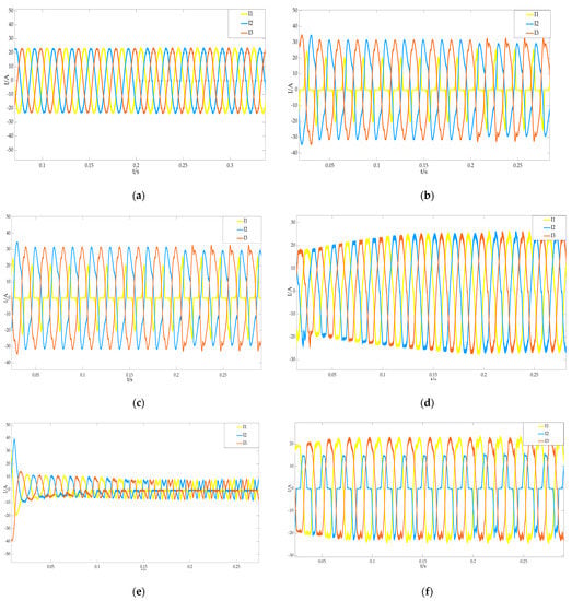 We set the sampling frequency to 4 kHz, the simulation time was 0.6 s, the pre-rectifier circuit added SVPWM modulation optimization waveform at 0.2 s, and the post-stage converter adopted single phase shift (SPS) control to collect different types of open circuit fault inductor three-phase current I1, I2, and I3 waveforms, shown in