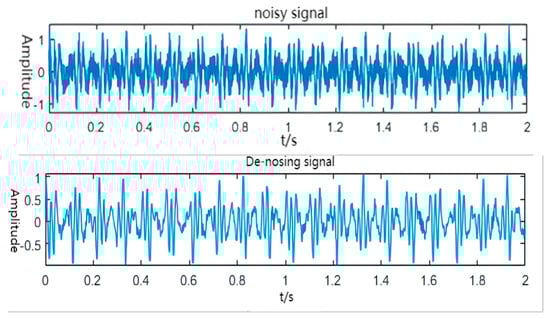The signal is analyzed by wavelet packets to further eliminate the noise margin present in the high-frequency section. After wavelet decomposition, the wavelet decomposition coefficient of useful signal is larger, and the wavelet decomposition coefficient of noise is smaller. Therefore, by setting the threshold function for denoising, the decomposition coefficient greater than the threshold is retained, while the decomposition coefficient less than the threshold is eliminated by zeroing. Based on wavelet transformation, wavelet packet analysis subdivides and decomposes the unprocessed high-frequency components in wavelet transform again. Compared with wavelet denoising, wavelet packet analysis has higher frequency resolution, which can further eliminate the noise margin in high-frequency parts and improve the denoising accuracy. The image comparison of noisy signal and de-noised signal are shown in