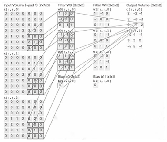Figure 9 is a schematic diagram of a three-channel convolution operation, the input image is 5 * 5 size, three channels, and then reduced to 3 * 3 size after output, the operation process includes two sets of convolution kernels, namely filters W0 and W1. The original two-dimensional image was input to the convolutional layer and the convolution kernel extracted the local features of the input image. Each convolution kernel corresponds to one feature, and by increasing the number of convolution kernels, different features were extracted from the same position of the input image, thereby forming different feature maps, which were arranged and combined as the output of the convolutional layer.