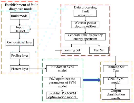 In this paper, SVM was used instead of the SoftMax classification layer of the CNN network, and the model training part used a large amount of fault data to train the diagnostic model. The model operation process is shown in