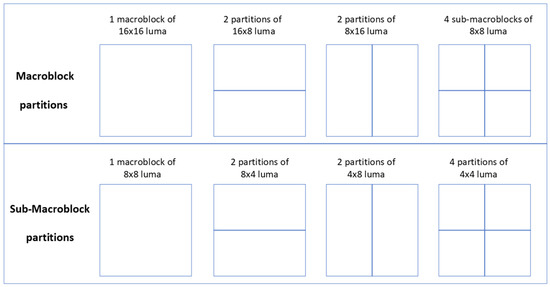 Meanwhile, in video compression, the relation between Inter-frames is described as predicted frames (P frames) or bi-directional predicted frames (B frames). P frames refer to previous frames for compression/decompression and it contains two types of macroblock, intra macroblock (I_* in Table 3) and predicted macroblock (P_* in Table 3). Table 3 shows the macroblock type for the P frame in H.264. A macroblock is a unit of pixels for video compression and its basic size in the case of H.264 video compression standard is 16 × 16 pixels. Each macroblock can be partitioned into a sub-macroblock such as 16 × 8, 8 × 16, 8 × 8 or 4 × 4 to acquire better compression results as Figure 3.