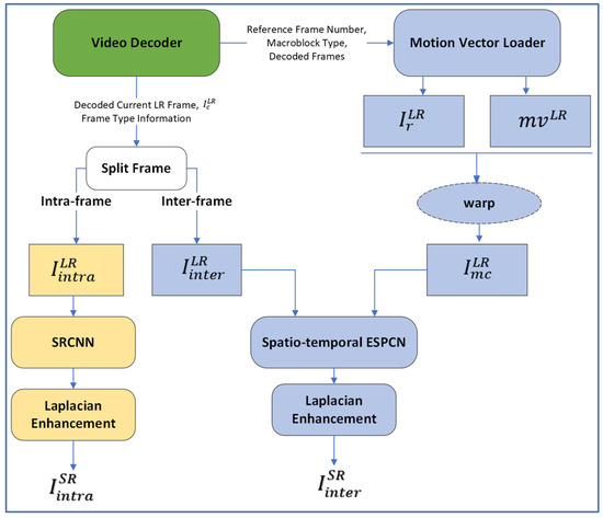 Figure 4 shows the overall architecture proposed. The architecture is mainly composed of two networks, SRCNN with Laplacian enhancement for Intra-frame upsampling in Table 4 [3] and Spatio-Temporal ESPCN [54] with Laplacian Enhancement for Inter-frame upsampling in Table 5. In Figure 4, and are decoded low-resolution frames. means a low-resolution reference frame which is a frame that is used as a reference frame to attain motion vector and is a low-resolution current frame that should be super-resolved. is classified into Intra-frame or Inter-frame by frame type information from a video decoder. Other necessary information for the proposed model such as the number of GOP, macroblock type, motion vector, and reference frame number in each macroblock can also be extracted from a video decoder. In general, the information is already transferred to the display module before the initiation of a video streaming playback. In other words, there is no additional burden to acquire the information for VSR model training or inference process.