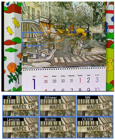 Visual comparison of 3× upsampling results on image sample “Calendar”, ground truth (GT), bilinear, nearest neighbor, Lanczos [58], bicubic [57], and CILVSR.