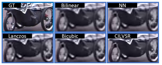Visual comparison of 3× upsampling results on image sample “Walk”, ground truth (GT), bilinear, nearest neighbor, Lanczos [58], bicubic [57], and CILVSR.