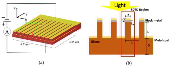 We modeled a silicon grating photodetector device shown in Figure 1 in Lumerical FDTD; the device active area was 4.25 μm by 4.25 μm, the top contact consisted of an Au-Cr layer and acted as the Schottky contact, and the bottom ohmic contact was made of aluminum. For the FDTD simulation, we set the thickness of the Au layer (tAu) to 15 nm and the Cr layer (tCr) to 20 nm. For etching depth (L) and substrate thickness (D), we set them at 425 nm. The period and width of the device was 425 nm and 4.25 μm. Λ is the grating period and a is the grating length with the duty cycle defined as Λ/a. A light source was placed on top of the structure with the plane wave propagating downward, perpendicular to the structure. Details of the MACE fabrication process are written in Appendix A. For the FDTD simulation, we defined the FDTD simulation range to cover one grating structure and set the boundary condition to periodic for the X and Y axis and PML for the Z axis.