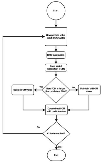 To achieve the optimum Pabs value over the geometric design parameters, we used particle swarm optimization (PSO), available in Lumerical FDTD with duty cycle as the particle, Pabs as the figure of merit, and criteria of 200 iterations. The PSO method flowchart is shown in Figure 2.